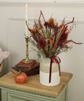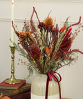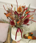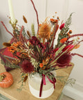 This exclusive design has been crafted using a selection of dried seed heads, grasses and foliage. Featuring shades of warm Orange, deep Burgundy & more.