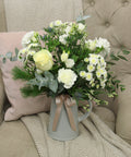 Let our florists create a beautiful, seasonal Jug design only the very best stems available. Featuring a selection of Winter stems including Eustoma, Santini, Thistles and Dianthus paired with seasonal Pinus and Eucalyptus.