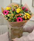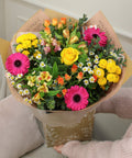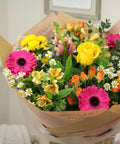 Handcrafted to order, this seasonal Hand tied Bouquet is bursting with Spring colour. Featuring a selection of Orange, Cerise & Yellow stems including Rose, Germini, Eustoma & Santini.