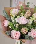 This beautifully scented bouquet features pink Peonies, sweetly scented Stocks, Larkspur, Phlox to name just a few.