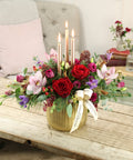 Let our florists create a beautiful, front facing candle designs using only the very best stems available. Featuring a selection of Red, Purple & Pink stems including Roses, Skimmia, Eustoma & Orchids.