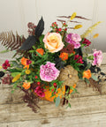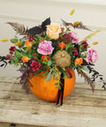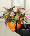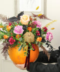 Let our florists create a beautiful, seasonal front facing Pumpkin arrangement using only the very best Autumn blooms. Featuring a selection of Orange, Red and Cerise stems. With both dried and sprayed additions for a touch of Halloween!